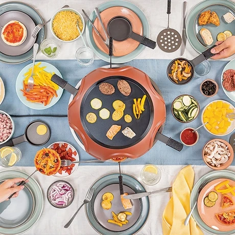 Avec une puissance de 1800 W et un élément chauffant à double boucle, il permet de cuire les différentes préparations en un rien de temps. Doté d’une plaque chauffante généreuse d’un diamètre de 25 cm, il se montre parfait pour assurer la cuisson des grillades de six personnes. L’appareil est fourni avec six pelles à pizza, six poêlons à raclette, un pour chaque ouverture et un emporte-pièce afin de découper facilement les disques de pâte à la taille des pelles ; à vous de choisir la garniture à déposer sur votre mini-pizza ou la tranche de fromage à faire fondre pour napper votre pomme de terre. Côté sécurité, un témoin lumineux indique son fonctionnement tandis que quatre pieds antidérapants lui confèrent une bonne stabilité sur la table.